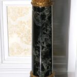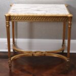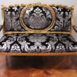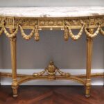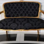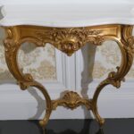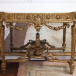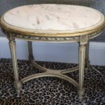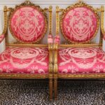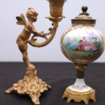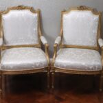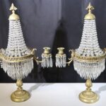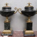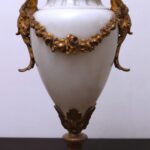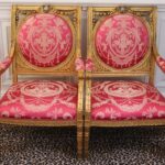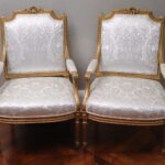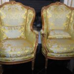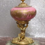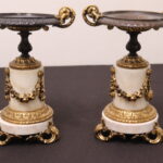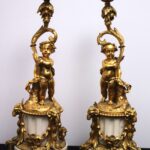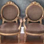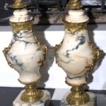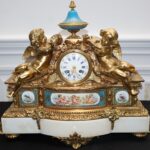 - Antique French Porcelain Clock, Marble Cassolettes, French Carved Wing Back Armchairs